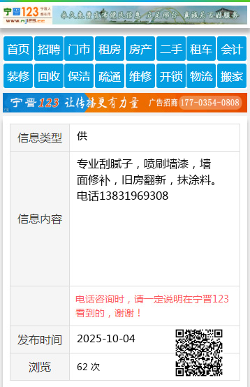 专业刮腻子,喷刷墙漆,墙面修补,旧房翻新,抹涂料。电话13831969308