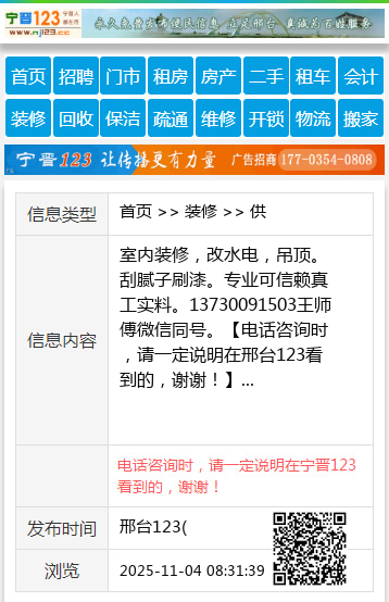 室内装修,改水电,吊顶。刮腻子刷漆。专业可信赖真工实料。13730091503王师傅微信同号。 【电话咨询时,请一定说明在邢台123看到的,谢谢!】 |