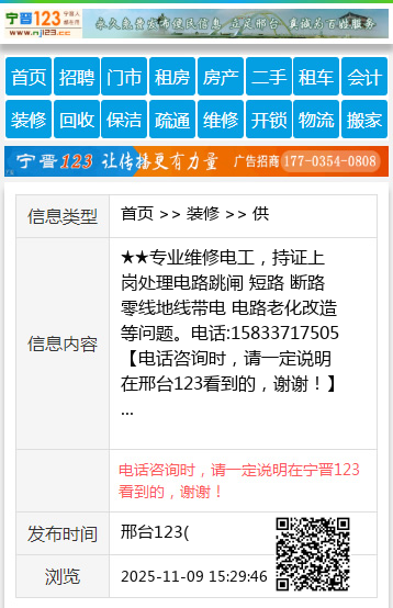 ★★专业维修电工,持证上岗处理电路跳闸 短路 断路 零线地线带电 电路老化改造等问题。电话:15833717505 【电话咨询时,请一定说明在邢台123看到的,谢谢!】 |