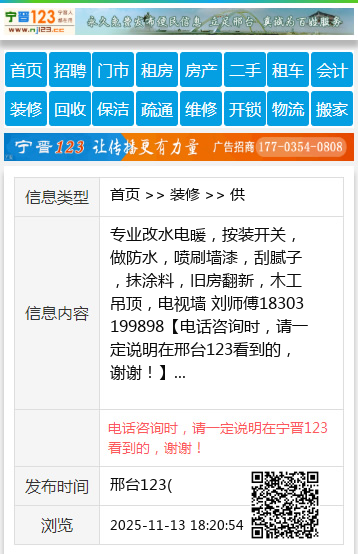专业改水电暖,按装开关,做防水,喷刷墙漆,刮腻子,抹涂料,旧房翻新,木工吊顶,电视墙 刘师傅18303199898 【电话咨询时,请一定说明在邢台123看到的,谢谢!】 |
