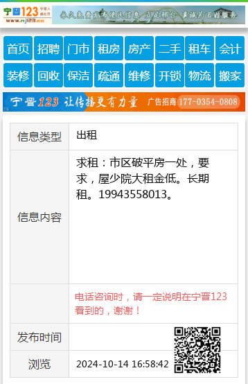 求租:市区破平房一处,要求,屋少院大租金低。长期租。19943558013。