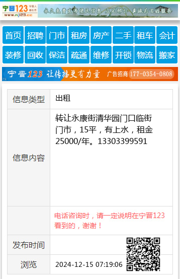 转让永康街清华园门口临街门市,15平,有上水,租金25000/年。13303399591