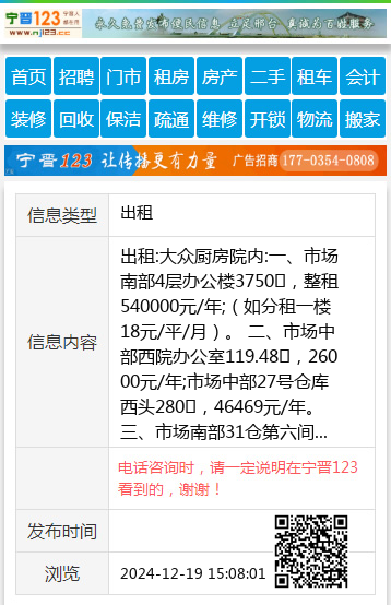 出租:大众厨房院内:一、市场南部4层办公楼3750㎡,整租540000元/年;(如分租一楼18元/平/月)。 二、市场中部西院办公室119.48㎡,26000元/年;市场中部27号仓库西头280㎡,46469元/年。三、市场南部31仓第六间92㎡,19872元/年。电话:3671616,13043190908