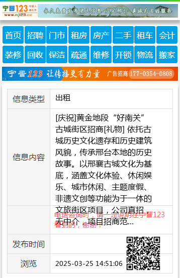 [庆祝]黄金地段“好南关”古城街区招商[礼物] 依托古城历史文化遗存和历史建筑风貌,传承邢台本地的历史故事。以邢襄古城文化为基底,涵盖文化体验、休闲娱乐、城市休闲、主题度假、非遗文创等功能为于一体的文旅街区项目,公司直招,无中介,项目招商范围:品牌餐饮、商务宴请、特色小吃、精品零售、儿童游乐、非遗文创、二次元、酒吧、KTV、健身等业态 [爆竹]位置优越!位于市中心潮流繁华商圈!人流量大! [爱心]交通便利!周边公交线路多!停车方便![太阳]先到先得,速来洽谈! 联系方式:18832992627刘经理(微信同号) |