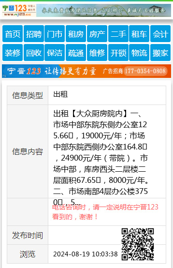 出租【大众厨房院内】一、市场中部东院东侧办公室125.66㎡,19000元/年;市场中部东院西侧办公室164.8㎡,24900元/年(带院)。市场中部,库房西头二层楼二层面积67.65㎡,8000元/年。二、市场南部4层办公楼3750㎡,540000元/年。三、市场南部2层办公楼542.3㎡,赠送独立小院,84000元/年。交通便利,简单装修,可用作办公室、培训机构、宾馆等。电话:3671616,13043190908 |