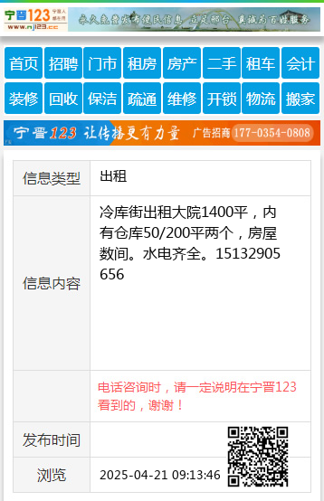 冷库街出租大院1400平,内有仓库50/200平两个,房屋数间。水电齐全。15132905656