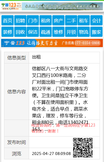 信都区八一大街与文苑路交叉口西行100米路南,二分厂对面出租一间门市使用面积22平米,门口宽敞停车方便。卫生间是独立干净卫生(不算在使用面积里)。水电齐全,适合早点,蔬菜水果店,理发,修车等行业,租金880元,电话13402471163。