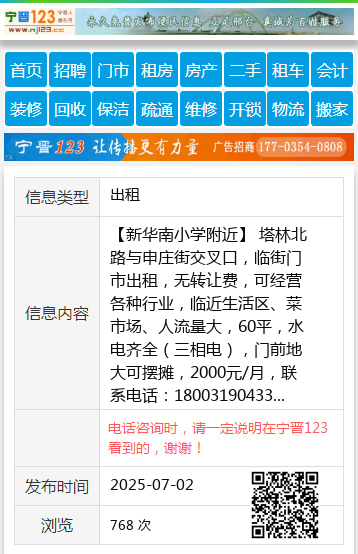 【新华南小学附近】 塔林北路与申庄街交叉口,临街门市出租,无转让费,可经营各种行业,临近生活区、菜市场、人流量大,60平,水电齐全(三相电),门前地大可摆摊,2000元/月,联系电话:18003190433