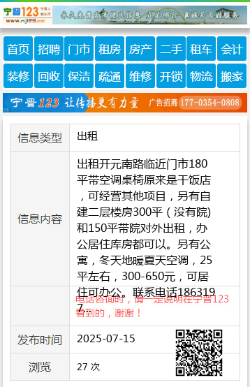 出租开元南路临近门市180平带空调桌椅原来是干饭店,可经营其他项目,另有自建二层楼房300平(没有院)和150平带院对外出租,办公居住库房都可以。另有公寓,冬天地暖夏天空调,25平左右,300-650元,可居住可办公。联系电话18631977267。开元南路体育彩票转让电话13031903590。