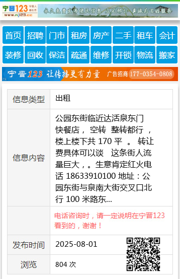 公园东街临近达活泉东门 快餐店, 空转 整转都行 ,楼上楼下共 170 平 。 转让费具体可以谈 这条街人流量巨大,。生意肯定红火电话 18633910100 地址:公园东街与泉南大街交叉口北行 100 米路东