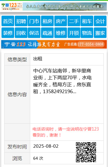 中心汽车站南邻,新华里商业街,上下两层70平,水电暖齐全,格局方正,房东直租,13582492196