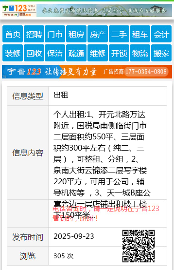 个人出租:1、开元北路万达附近,国税局南侧临街门市二层面积约550平、三层面积约300平左右(纯二、三层),可整租、分组,2、泉南大街云锦添二层写字楼220平方,可用于公司,辅导机构等 ,3、天一城B座公寓旁边一层店铺出租楼上楼下150平米,4.出租东崇礼小区1号楼底商,面积约70平两室一卫,水电齐全,有三相电,电话15833618838 。 |