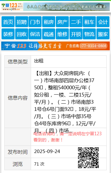 【出租】大众厨房院内: (一)市场南部四层办公楼3750㎡,整租540000元/年(如分租,一楼、二楼15元/平/月)。(二)市场南部31号仓6号门面92㎡,18元/平/月。(三)市场中部35号仓4号东库房96㎡,12元/平/月。(四)市场西南口12号仓二楼67.65㎡,8元/平/月。交通便利,可做门市、办公、仓库等。 【另出租】(一)位于豫让桥路与金泉大街交叉口南行临街磅房14.55㎡和地磅占地51.2㎡,1050元/月;(二)开元北路168号写字楼五楼和六楼,每层22万元/1000平。电话:3671616, 13043190908. |