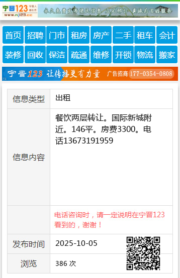 餐饮两层转让。国际新城附近。146平。房费3300。电话13673191959