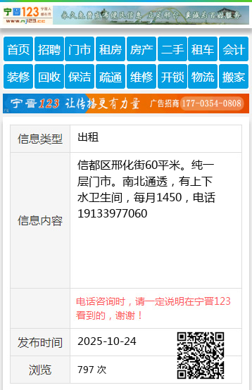 信都区邢化街60平米。纯一层门市。南北通透,有上下水卫生间,每月1450,电话19133977060