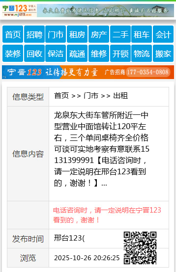 龙泉东大街车管所附近一中型营业中面馆转让120平左右,三个单间桌椅齐全价格可谈可实地考察有意联系15131399991 【电话咨询时,请一定说明在邢台123看到的,谢谢!】 |