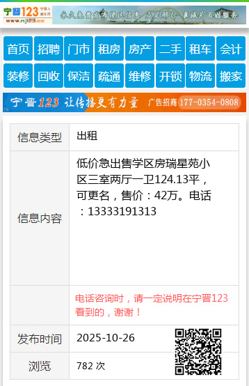 低价急出售学区房瑞星苑小区三室两厅一卫124.13平,可更名,售价:42万。电话:13333191313