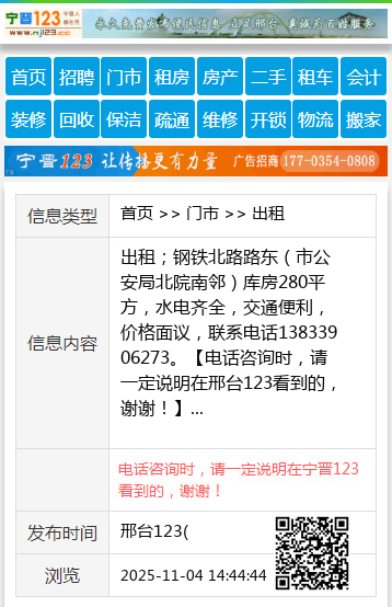 出租;钢铁北路路东(市公安局北院南邻)库房280平方,水电齐全,交通便利,价格面议,联系电话13833906273。 【电话咨询时,请一定说明在邢台123看到的,谢谢!】 |