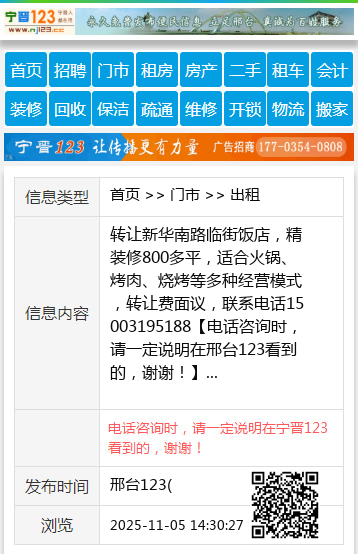 转让新华南路临街饭店,精装修800多平,适合火锅、烤肉、烧烤等多种经营模式,转让费面议,联系电话15003195188 【电话咨询时,请一定说明在邢台123看到的,谢谢!】 |