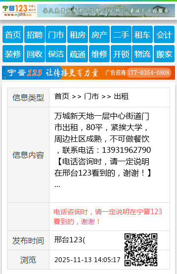 万城新天地一层中心街道门市出租,80平,紧挨大学,周边社区成熟,不可做餐饮,联系电话:13931962790 【电话咨询时,请一定说明在邢台123看到的,谢谢!】 |