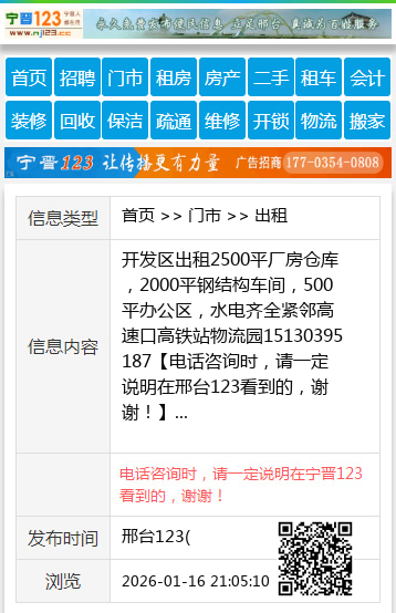 开发区出租2500平厂房仓库,2000平钢结构车间,500平办公区,水电齐全紧邻高速口高铁站物流园15130395187 【电话咨询时,请一定说明在邢台123看到的,谢谢!】 |