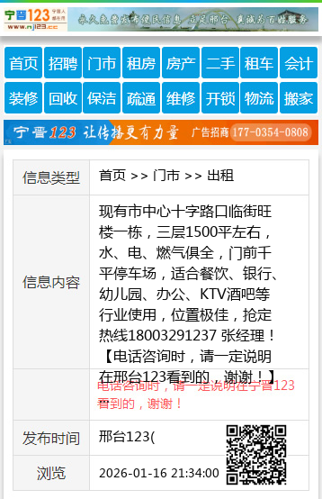 现有市中心十字路口临街旺楼一栋,三层1500平左右,水、电、燃气俱全,门前千平停车场,适合餐饮、银行、幼儿园、办公、KTV酒吧等行业使用,位置极佳,抢定热线18003291237 张经理! 【电话咨询时,请一定说明在邢台123看到的,谢谢!】 |