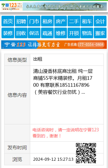 清山漫香林底商出租 纯一层商铺55平米精装修。月租1700 有意联系18511167896 (美容餐饮行业勿扰)