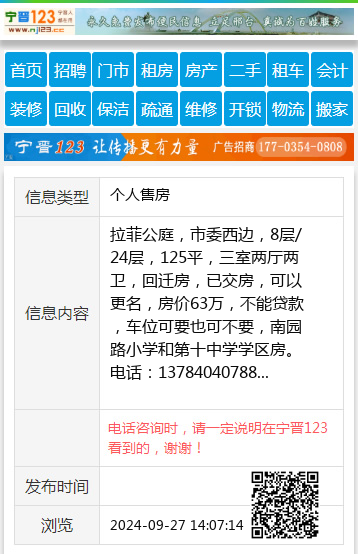 拉菲公庭,市委西边,8层/24层,125平,三室两厅两卫,回迁房,已交房,可以更名,房价63万,不能贷款,车位可要也可不要,南园路小学和第十中学学区房。电话:13784040788