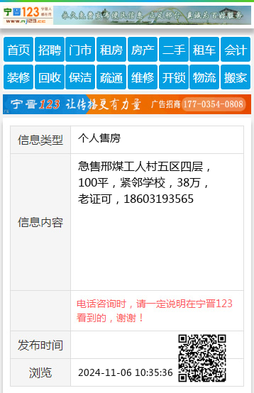 急售邢煤工人村五区四层,100平,紧邻学校,38万,老证可,18603193565