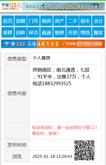 邢钢南区,南北通透,七层,91平米,出售37万,个人电话18832993525