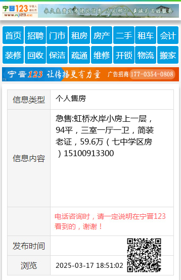 急售:虹桥水岸小房上一层,94平,三室一厅一卫,简装老证,59.6万(七中学区房)15100913300