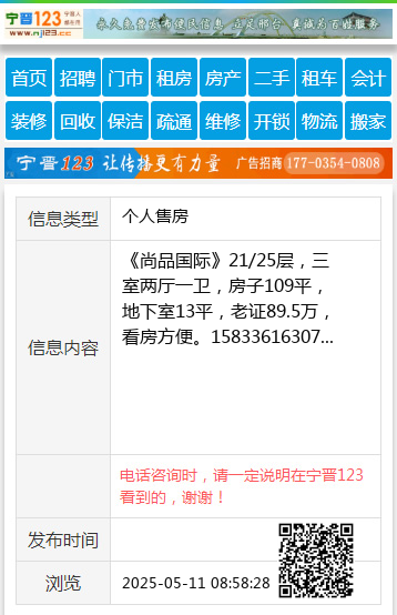 《尚品国际》21/25层,三室两厅一卫,房子109平,地下室13平,老证89.5万,看房方便。15833616307