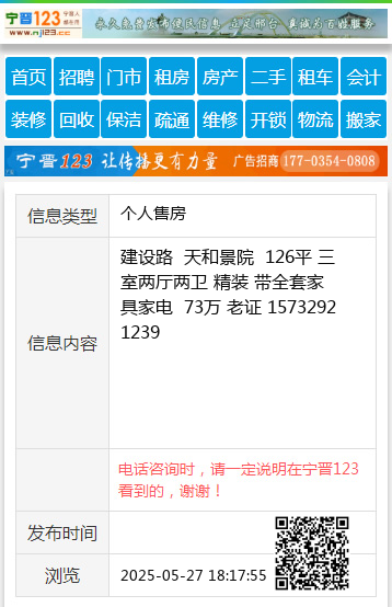 建设路 天和景院 126平 三室两厅两卫 精装 带全套家具家电 73万 老证 15732921239