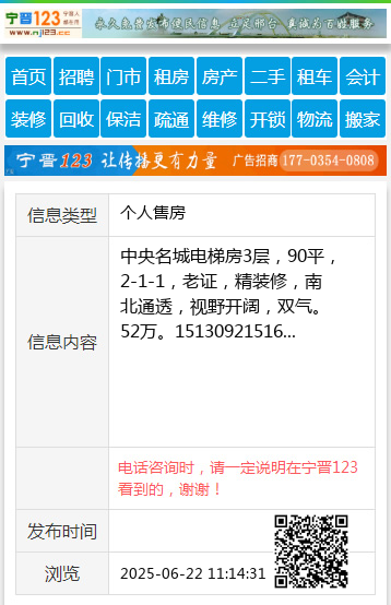 中央名城电梯房3层,90平,2-1-1,老证,精装修,南北通透,视野开阔,双气。52万。15130921516 【电话咨询时,请一定说明在邢台123谢谢!】 |