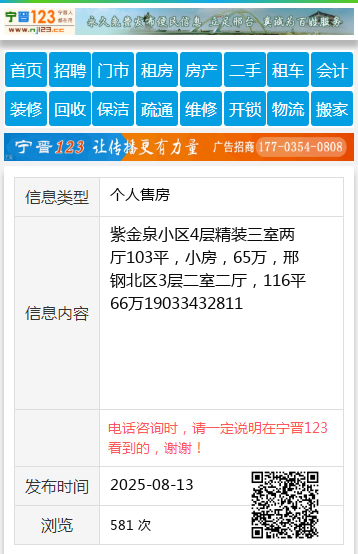 紫金泉小区4层精装三室两厅103平,小房,65万,邢钢北区3层二室二厅,116平66万19033432811
