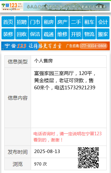 富强家园三室两厅,120平,黄金楼层,老证可贷款,售60来个,电话15732921239
