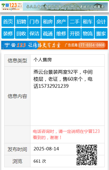 燕云台景装两室92平,中间楼层,老证,售60来个,电话15732921239