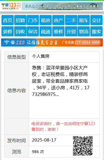 急售:蓝洋荣景园小区大产权,老证税费低,精装修两居室,带全套品牌家具家电,94平,送小房,41万,17732986975 【电话咨询时,请一定说明在邢台123看到的,谢谢!】 |