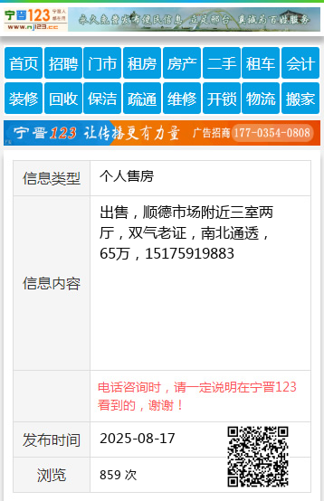 出售,顺德市场附近三室两厅,双气老证,南北通透,65万,15175919883