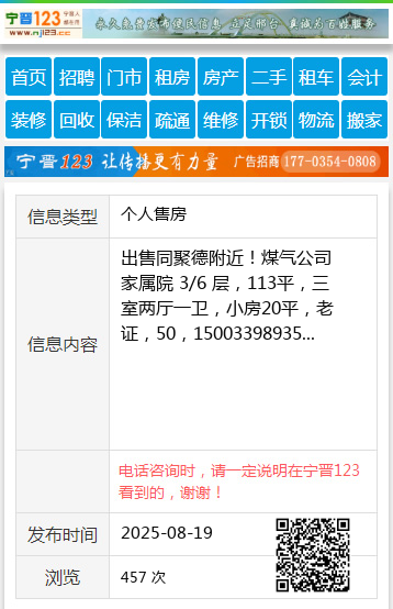 出售同聚德附近!煤气公司家属院 3/6 层,113平,三室两厅一卫,小房20平,老证,50,15003398935