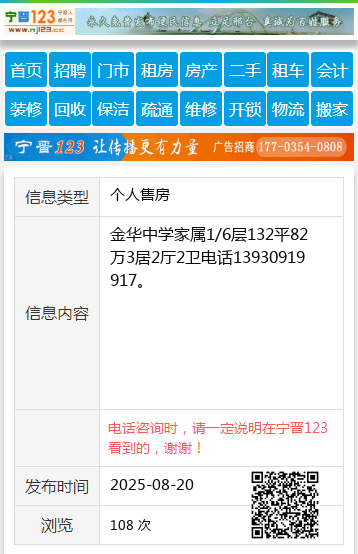 金华中学家属1/6层132平82万3居2厅2卫电话13930919917。