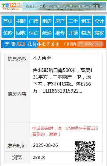 售:邯郸路口南500米,高层131平方,三室两厅一卫,地下室,有证可贷款。售价56万,☎️18632915922