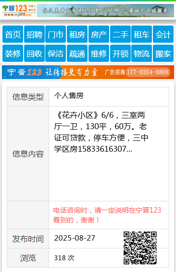 《花卉小区》6/6,三室两厅一卫,130平,60万。老证可贷款,停车方便,三中学区房15833616307