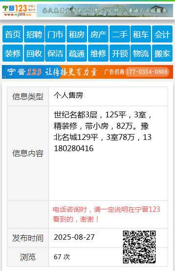 世纪名都3层,125平,3室,精装修,带小房,82万。豫北名城129平,3室78万,13180280416