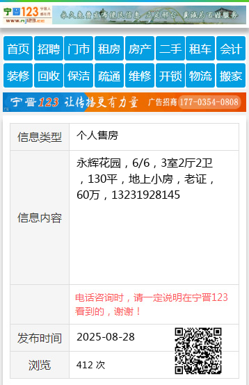 永辉花园,6/6,3室2厅2卫,130平,地上小房,老证,60万,13231928145