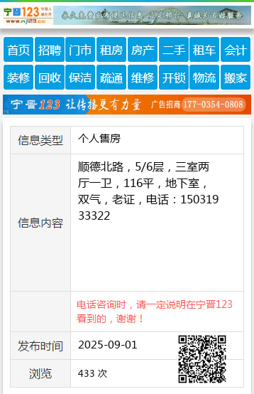 顺德北路,5/6层,三室两厅一卫,116平,地下室,双气,老证,电话:15031933322