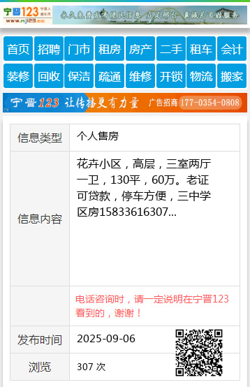 花卉小区,高层,三室两厅一卫,130平,60万。老证可贷款,停车方便,三中学区房15833616307