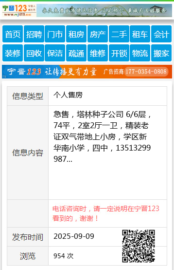 急售,塔林种子公司 6/6层,74平,2室2厅一卫,精装老证双气带地上小房,学区新华南小学,四中,13513299987 【电话咨询时,请一定说明在邢台123看到的,谢谢!】 |