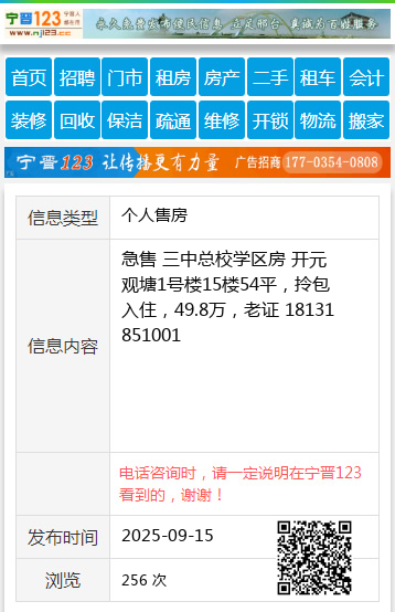 急售 三中总校学区房 开元观塘1号楼15楼54平,拎包入住,49.8万,老证 18131851001