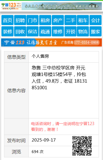 急售 三中总校学区房 开元观塘1号楼15楼54平,拎包入住,49.8万,老证 18131851001